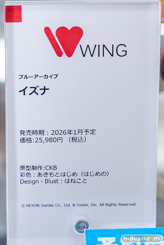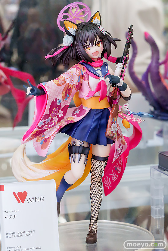ウイングの新作美少女フィギュア「ブルーアーカイブ -Blue Archive- イズナ」の彩色サンプルが、あみあみ 秋葉原ラジオ会館店で展示!『人気ゲーム『ブルーアーカイブ -Blue Archive-』より、百鬼夜行連合学院所属、忍術研究部の「イズナ」が1/7スケールフィギュアとなって登場!キヴォトス最高の忍者を目指すイズナの、ハツラツとした姿を忠実に立体化しました。鮮やかな着物の花柄や、大きくてモフモフした尻尾の造形、愛用の「イズナ流スーパー忍具」に至るまで、丁寧に再現しております。』というもので、原型制作はCKBさん。彩色はあきもとはじめ(はじめの)さん。その展示の様子を画像レビューとしてお伝えします!