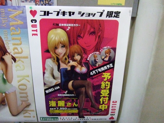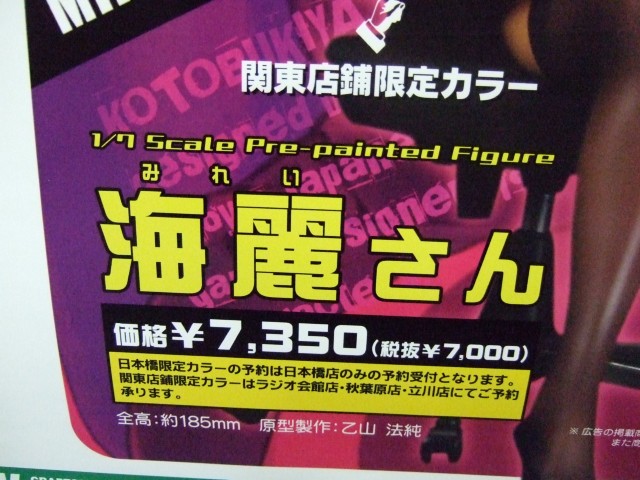 12月8日、コトブキヤラジオ会館にて、コトブキヤショップ限定「海麗(みれい)さん」のポスターが掲示されていました。これは、「セラちゃん」(参考レビュー)の元イラストも描かれている、山下しゅんや氏デザインの「海麗(みれい)さん」を立体化したもの。告知ポスターによると、しゅんろぐさんに掲載されたカラーは「関東店舗限定」で、金髪で白スーツの「大阪日本橋限定」もあるみたい。