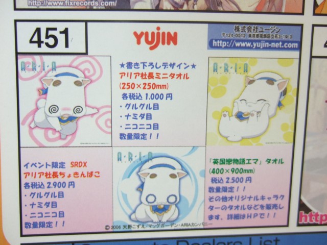 Yujinでは、アリア社長ちょきんばこ&ミニタオル、エマタオルなどの販売。