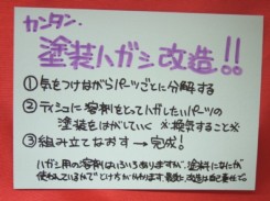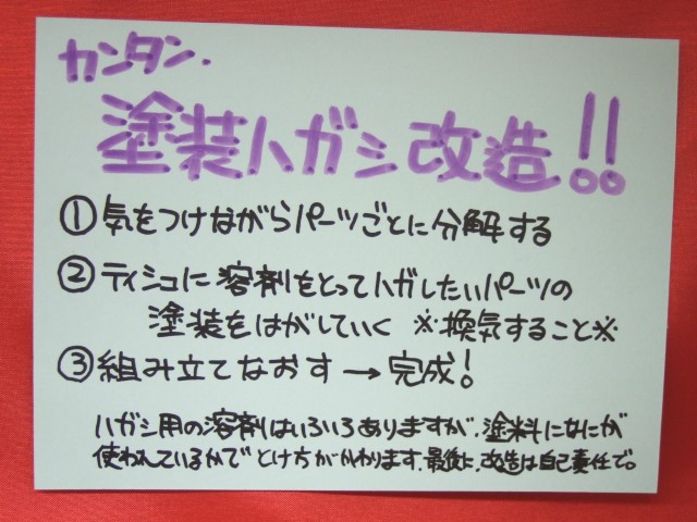「カンタン、塗装ハガシ改造!!」として、塗装ハガシ改造の手順が書かれたPOP。もちろんやるときは「自己責任」でやってくださいねw