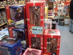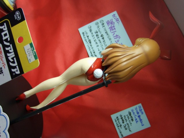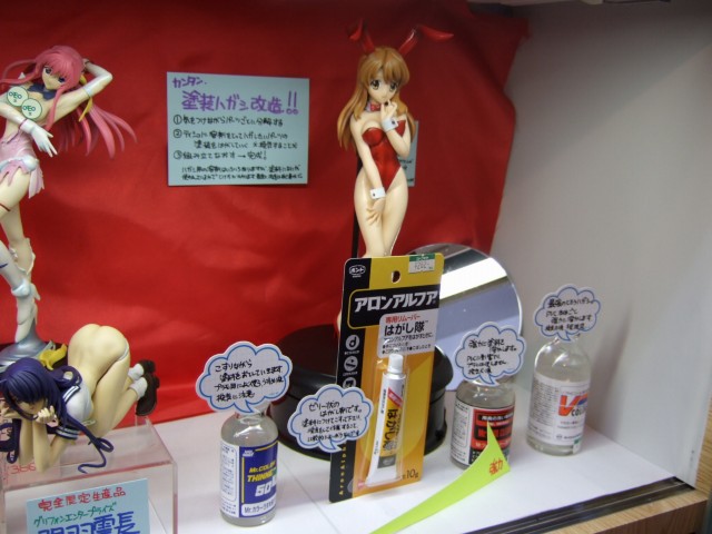 コトブキヤ秋葉原店の、以前気がついたらグリフォンコーナーがあった一角に、「カンタン、塗装ハガシ改造!!」として、PVCフィギュアの塗装を剥がす際に用いるアイテムを紹介するコーナーが出来ていました。そこに、塗装ハガシ改造例として、アトリエ彩「朝比奈みくる バニーガール 赤バニーVer.」(AA)の脚部の塗装をはがし、生足状態にした改造例が展示されていました。
