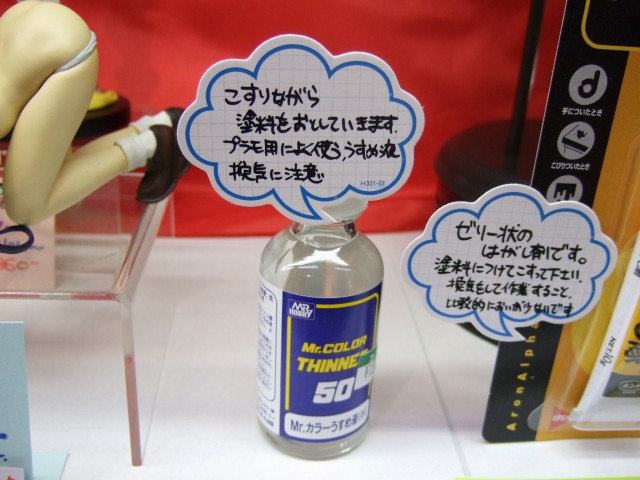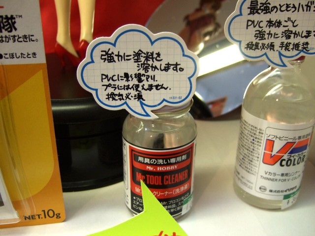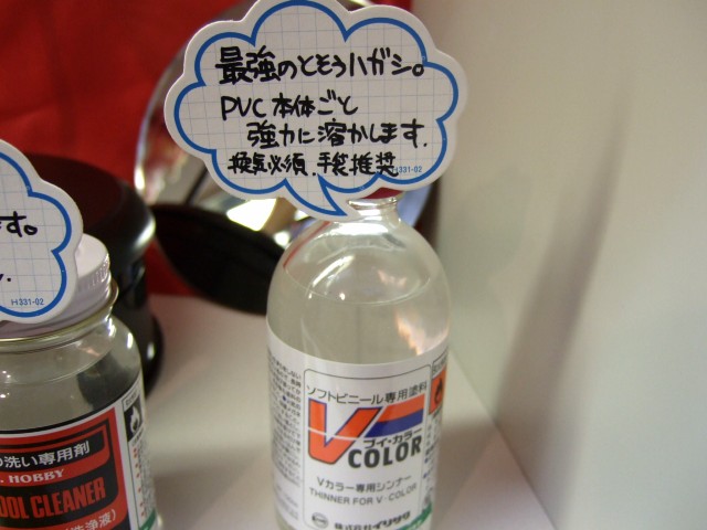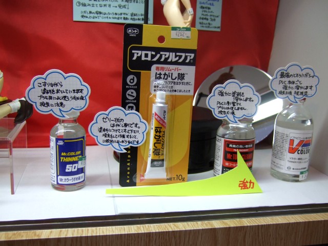 コトブキヤ秋葉原店の、以前気がついたらグリフォンコーナーがあった一角に、「カンタン、塗装ハガシ改造!!」として、PVCフィギュアの塗装を剥がす際に用いるアイテムを紹介するコーナーが出来ていました。