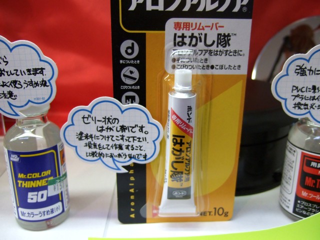 その改造例の手前に置かれた4種の塗装はがし用(?)アイテム。GSIクレオス「 Mr.カラーうすめ液 」(RA)、コニシ「コニシ アロンアルファ用 はがし隊」(RA)、GSIクレオス「Mr.ツールクリーナー」(RA)、イリサワ「Vカラー 専用シンナー」(RA)と、左から右に行くほど剥がす力も強力になるみたいです。