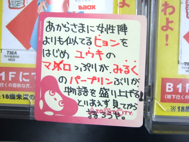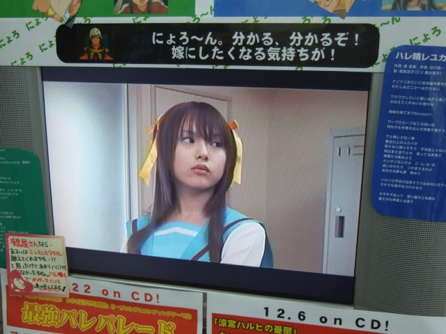 ヨドバシAkibaではすでに売られていた、「涼宮ハヒルの憂鬱」(AA)ですが、12日にはゲームシティでも販売されていることに気がつきました。しかも地下のアダルトフロアだけではなく、3Fの映像・音楽フロアでも販売していて、キャラソンVol.4 鶴屋さん発売の際お伝えしたハルヒコーナーの映像が、POPによると「あからさまに女性陣より似ているヒョン」などの、ハヒルのデモ映像に。