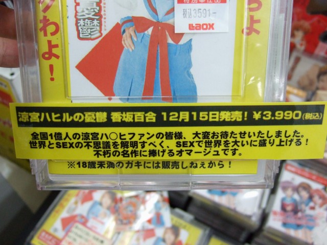 ヨドバシAkiba などではすでに売られていた、「涼宮ハヒルの憂鬱」(AA)ですが、12日にはゲームシティで、地下のアダルトフロアだけではなく、「早漏い!!罰金っ!!」と書かれたPOPのあった、3Fの映像・音楽フロアでも販売されていることに気がつきました。
