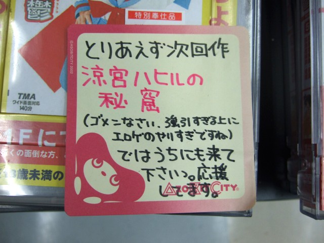 さらに、もう一つのPOPには「とりあえず次回作 涼宮ハヒルの秘窟(ごめんなさい。強引すぎる上にエロゲのやりすぎですね) ではうちにも来て下さいっ。応援してます。」とされていて、早くも次回作を期待しているみたいですw