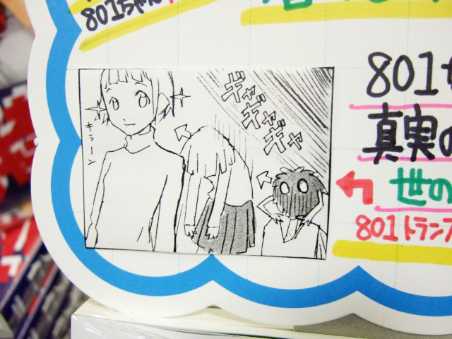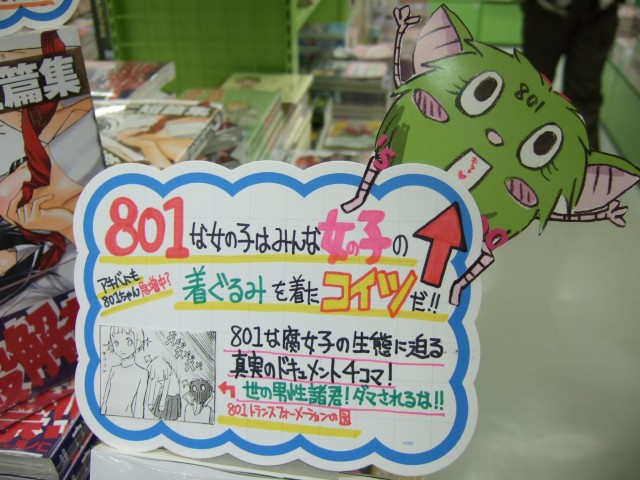 メロンに掲示されていたPOPによると、「801な女の子は、みんな女の子のきぐるみを着たコイツ(801ちゃん)だ!」「801な腐女子の生態に迫る真実のドキュメント4コマ」とのことですw