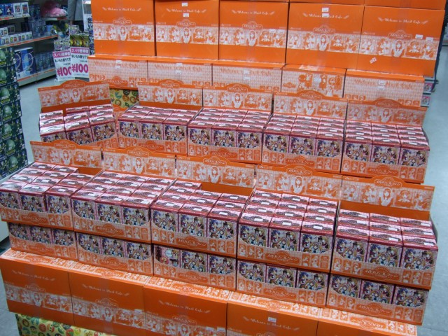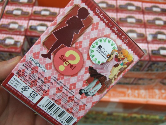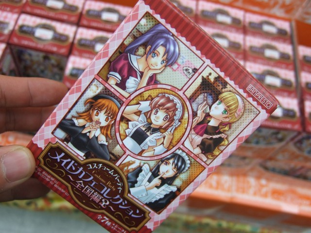 カフェ ショコラッテ、私立メイリッシュ学園、天神スタイル、CCOちゃ、M’s melody の5つのメイド喫茶から全7種+シークレット1種の計8種。1BOX12個入り。