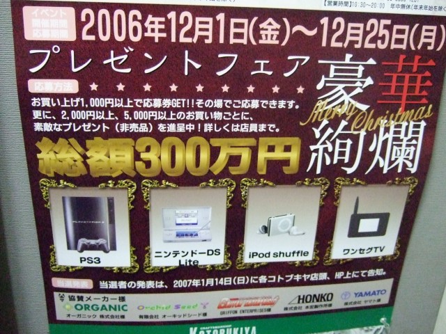 これは、該当店舗で1,000円以上買い物をすると、応募券がもらえて、そのあと2,000円以上の買い物をするとスタンプ1個もらえて、さらにそのあと5,000円以上の買い物をするともう一個スタンプがもらえて、スタンプ1個、2個のランクで必ず景品がもらえるというもの。 もらった後は、その応募券に必要事項を記入して応募すると、PS3なんかが当たるみたい。(詳しくは豪華絢爛プレゼントフェアページで)