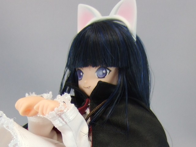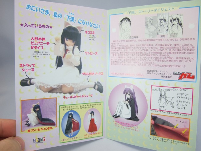 セット内容 本体・ドレス一式(ワンピース・フリル付きソックス・ショーツ・ストラップシューズ)・オプション(黒マント・ネコミミ・招き手パーツ)・インストカード