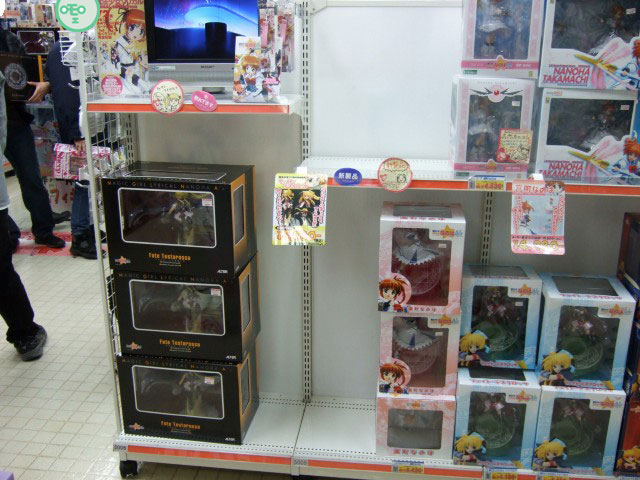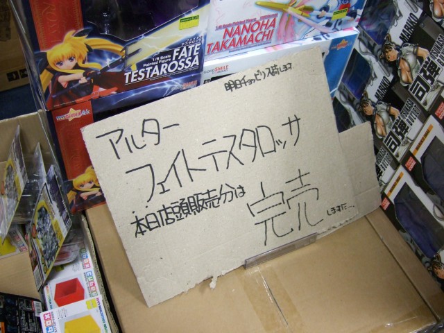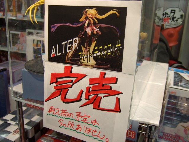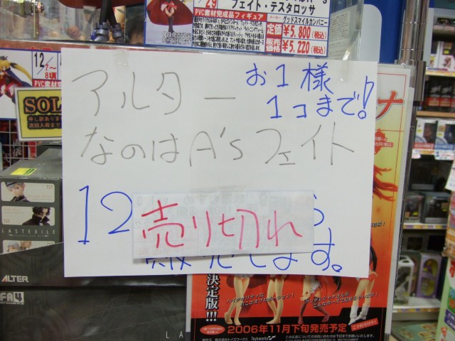 アキバでは15日から発売となった、アルターの「魔法少女リリカルなのはA’s フェイト・テスタロッサ」(RA)ですが、その箱のでかさにも関わらず、某店店員さんが「最近では珍しい売れっぷり」と言いわれていたように、アキバではほぼ完売状態。そのフェイト発売2日目のアキバでの様子をお伝えします。画像はアルターのアルヴィスのパッケをフェイトのパッケに入れてみた様子。