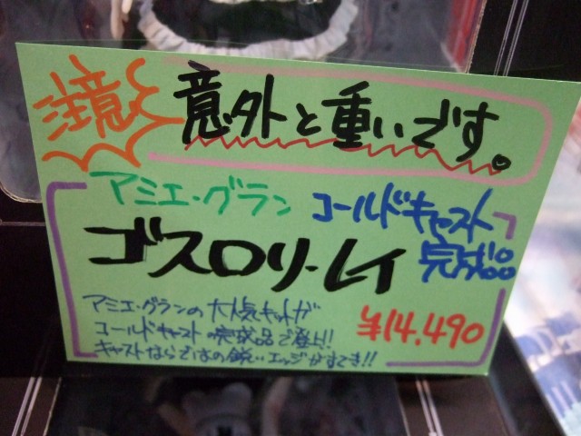 12月16日、コトブキヤ秋葉原店にて、アミエ・グランの「新世紀エヴァンゲリオン ゴスロリ・レイ」(AA)が発売されました。ポリストーン製完成品としては珍しい、全身が確認できるブリスターパッケージとなっていて、他のPVC完成品と一見見分けがつかず、PVC製と思って不用意に持つと、取り落とす可能性もあることからか、POPには「注意 意外と重いです。」とされていました。
