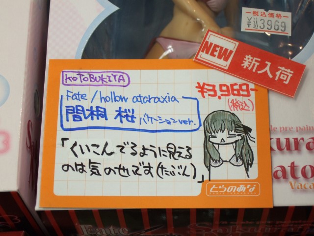 12月18日、コトブキヤの「Fate/hollow ataraxia 間桐 桜 ヴァケーションVer.」(AA)が発売されました。これは、PCゲーム「Fate/hollow ataraxia」の劇中で登場した、桜の水着姿を、ビキニパンツ左のヒモを結ぶ(解く?)途中のポーズで立体化したもの。とらのあなヘタレPOPによると、「くいこんでるように見えるのは気のせいです(たぶん)」とのこと。(くいこんでいる?部分)