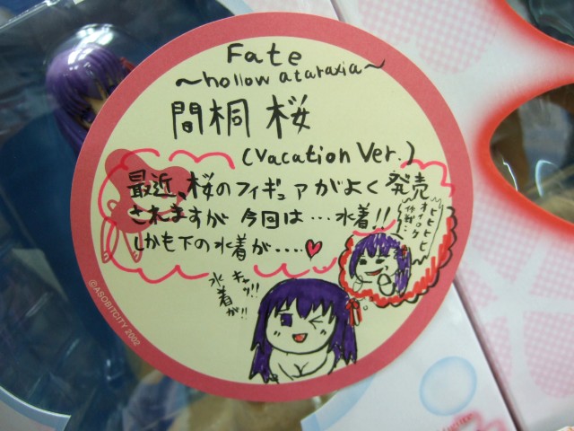 コトブキヤの商品説明によると「一大ムーブメントを巻き起こした『Fate/stay night』のファンディスク『Fate/hollow ataraxia』。ファンディスクという枠を大きく超えるシナリオ数、新キャラクターの登場、魅力的なキャラクター達の新しいコスチュームなどでファンを大いに楽しませた本作より、不遇に嘆く第3のヒロイン「間桐桜」を、わくわくザブーンでのデートで着用したビキニVer.で、彼女の魅力全開の造形で立体化。」というもの。(Fate/hollow ataraxia – Wikipedia)