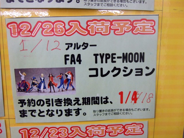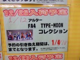 ソフマップ本店の新作フィギュア発売日掲示板によると、アルター「コレクションジィギュアシリーズ(FA4) TYPE-MOON コレクション」(ワンフェス2006夏での展示の様子)が2007年1月12日頃発売に延期になったみたいです。
