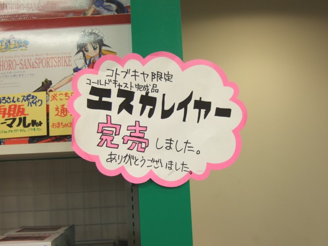 他、コトブキヤラジオ会館では、14日に発売された、ラジオ会館新オープン記念再販「超昂天使エスカレイヤー コールドキャストモデル」が完売していました。