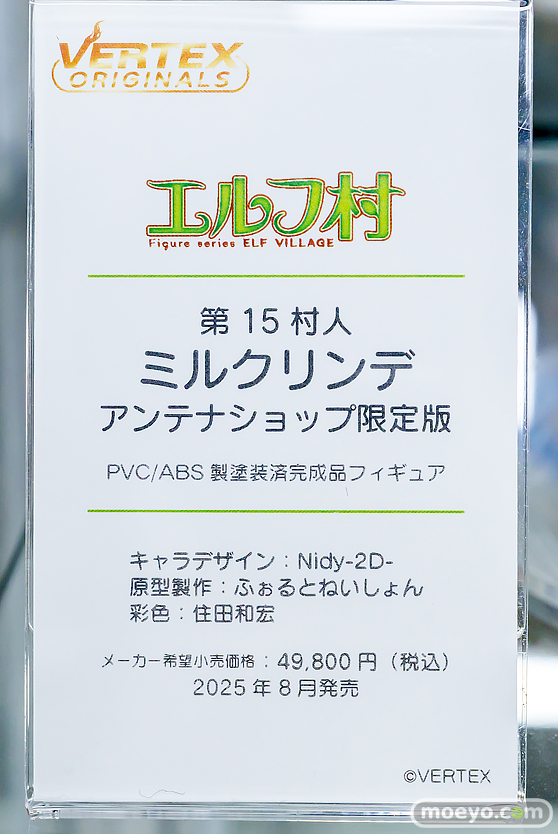 ヴェルテクスの新作美少女フィギュア「エルフ村 第15村人 ミルクリンデ アンテナショップ限定版」の軽装状態の彩色サンプルが、あみあみ 秋葉原ラジオ会館店で展示!『オリジナルフィギュアシリーズ『エルフ村』に、Nidy-2D-氏デザインによる村の見習い錬金術師・ミルクリンデが登場!従姉妹のルルーニャとはちがい、運動はちょっぴり苦手。だけど勉強は得意で、頭の中には村中が驚くほどの知識がぎっしり。ついに成功させたのは、“何でも溶かすスライム”の錬成――』というもので、原型制作はふぉるとねいしょんさん。彩色担当は住田和宏さん。キャラクターデザインはNidy-2D-さん。その展示の様子を画像レビューとしてお伝えします!
