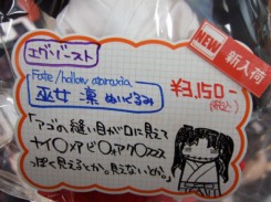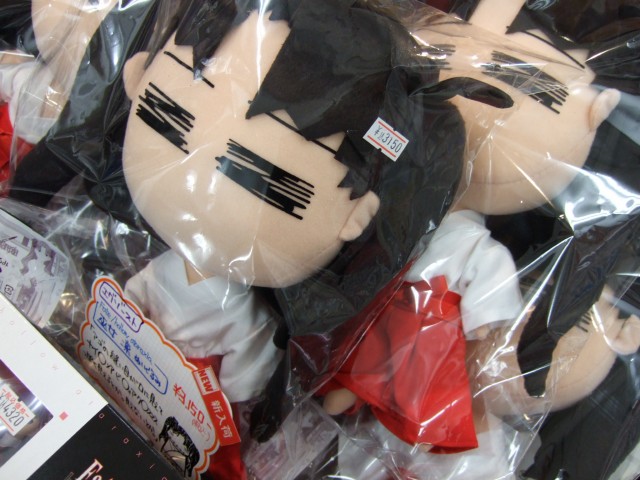 12月19日、エグゾースト 「Fate/hollow ataraxia ぬいぐるみ 巫女凛」(AA)が発売されました。これは、「お布施をよこしなさい!」として、キャラシティに告知POPもあった「Fate/hollow ataraxia」の遠坂神社の巫女凛を、へたれ化してぬいぐるみにしたもの。とらのヘタレPOPによると「アゴの縫い目が口に見えて ナイ○メアビ○ォアク○スマスっぽく見えるとか。見えないとか。」