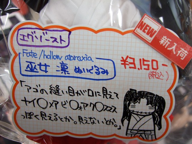 アニメイト秋葉原店では、巫女凛のとなりで、日本橋では「これはひどい」と絶賛の声が!という、エグゾースト「いとうのいぢ ぬいぐるみ」も売られていました。(ムービックの商品詳細)