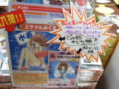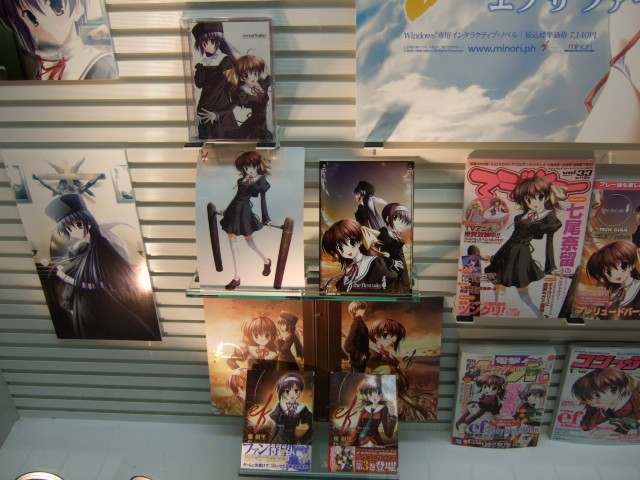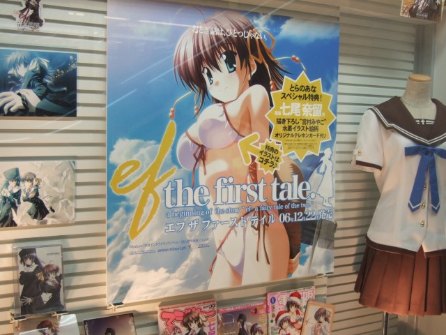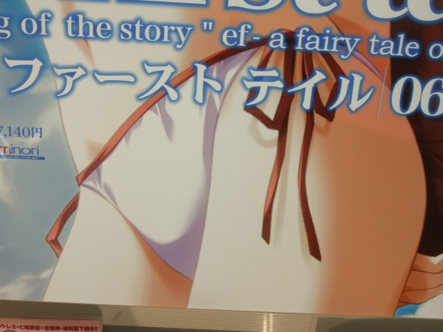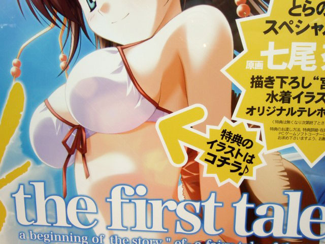 とらのあな本店の店頭ウインドウが、minoriの「ef – the first tale.」(AA)に変わっていました。そこには七尾奈留氏描き下ろしの購入特典テレカの宮村みやこ水着イラストがおおきく掲示されていて、「特典イラストはこちら!」と書かれた矢印の先はどう見ても乳w 他、「MELTY BLOOD Act Cadenza 究極攻略バイブル」(AA)、「ドラゴンオールスターズF 涼宮ハルヒの祭典」(AA)とか。