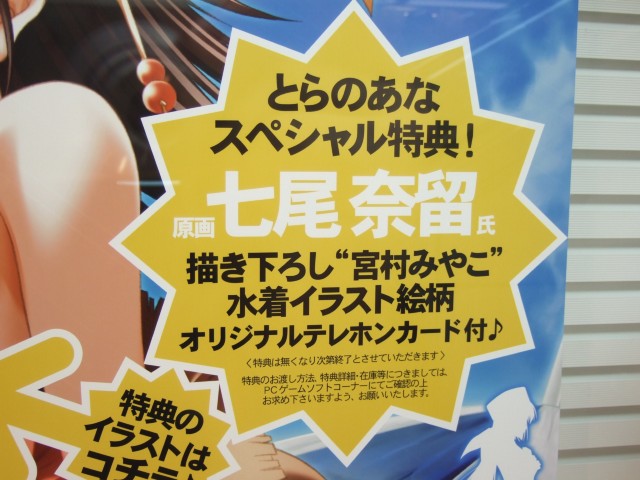 そこには七尾奈留氏描き下ろしの購入特典テレカの宮村みやこ水着イラストがおおきく掲示されていて、「特典イラストはこちら!」と書かれた矢印の先はどう見ても乳w