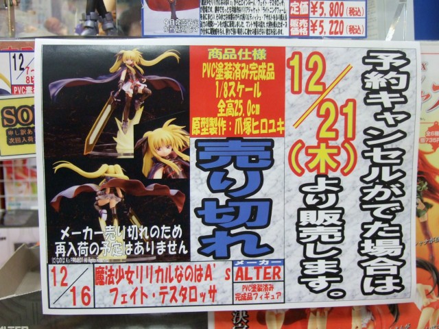■ 発売後、アキバでは発売後3日で完売したアルターフェイト(参考レビュー)ですが、19日にはキャラシティに若干数再入荷していました。お話によると「今後も数回、少量ながら入荷する可能性はあります。あくまで可能性ですが。」とのこと。ヤマギワソフトアニメ館では、POPによると、予約キャンセルがでた場合、12月21日(木)に販売するみたいです。完売したみたいです。