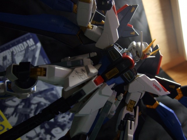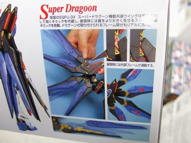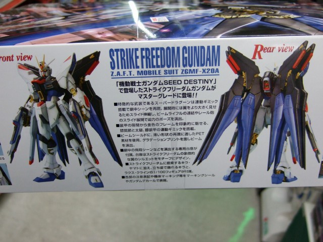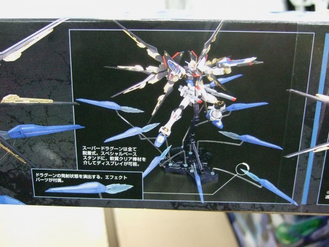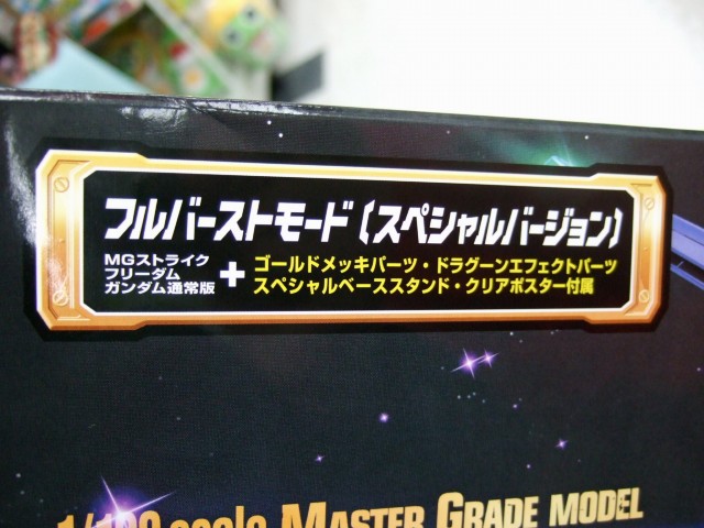 こちらは、ノーマル版に、ゴールドメッキパーツ、ドラグーンエフェクト、クリアーブルーフライングベース、クリアーポスターが付属した「1/100 MG ストライクフリーダムガンダム フルバーストモード」のパッケ。ポスターがはいっている為か、かなり大きな箱でした。