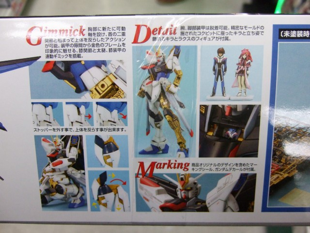 1/100スケールで、付属武器はビームサーベル×2本、ビームシールド、MS内部に搭乗用の1/100キラ・ヤマト、飾り用の1/100キラ・ヤマト、1/100ラクス・クライン、ホイルシール、マーキングシール、ドライデカール付属。
