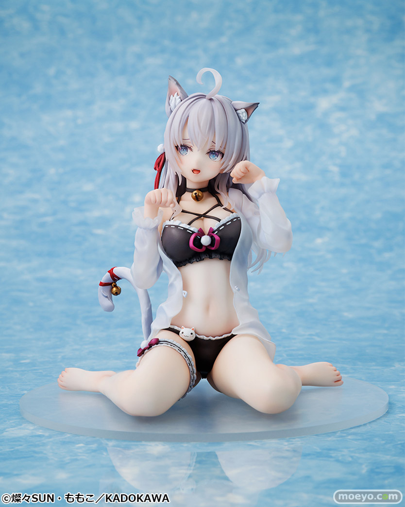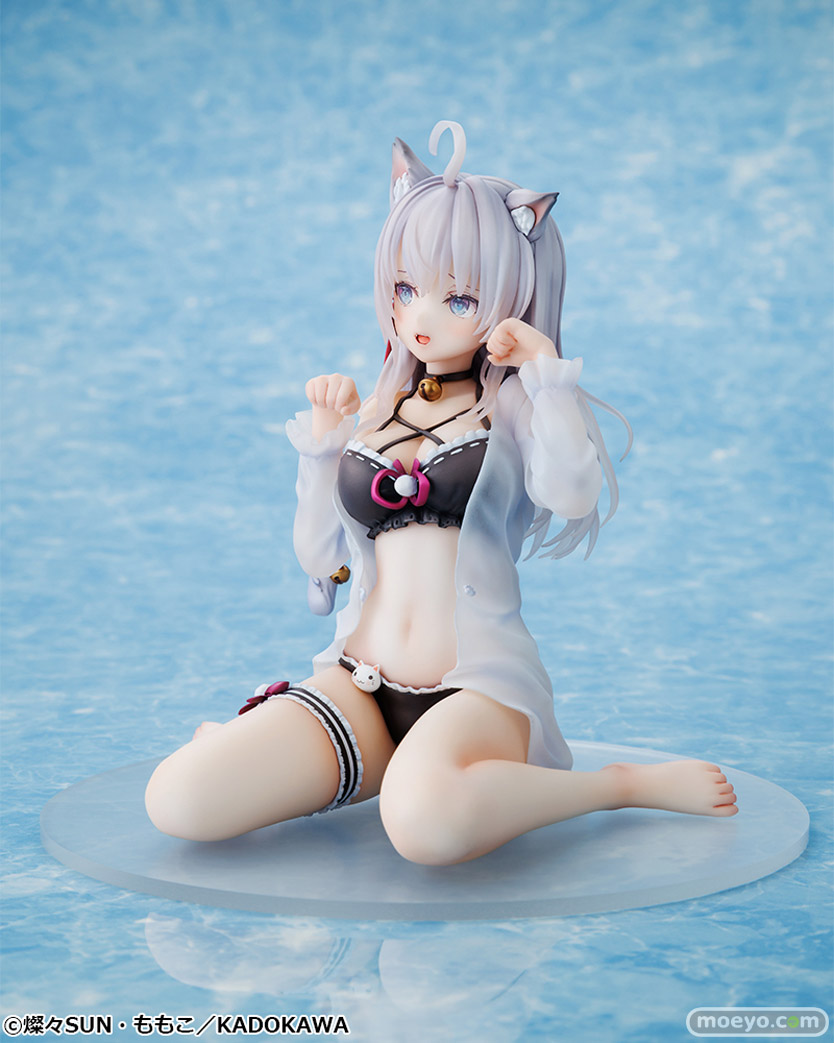 本アイテムは、原作イラストレーター・ももこ先生が原作小説のリバーシブルカバー用に描き下ろしたイラストをモチーフに、アーリャが猫耳水着姿で猫ポーズをしている姿を立体化。恥ずかしそうに上目遣いでこちらを見つめる表情を丁寧に再現!はだけたシャツもクリア素材で表現しており、ももこ先生の透明感のあるイラストの雰囲気を再現しています。
