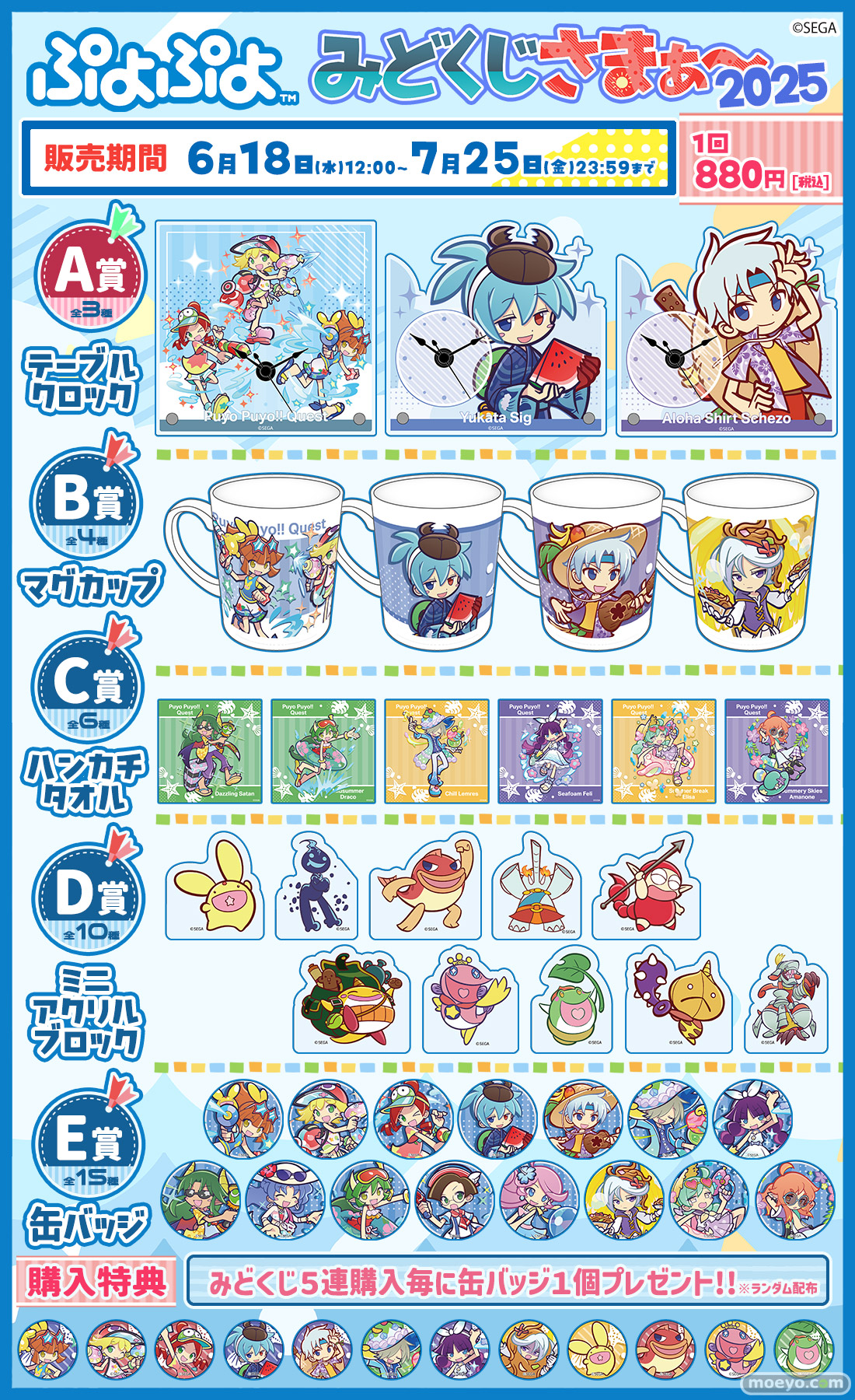 国民的落ち物アクションパズルゲーム『ぷよぷよ』シリーズより、みどくじNET初のぷよぷよオンラインくじが登場!!商品ラインナップは、A賞「テーブルクロック(全3種)」B賞「マグカップ(全4種)」C賞「ハンカチタオル(全6種)」D賞「ミニアクリルブロック(全10種)」E賞「缶バッジ(全15種)」となっております。また購入特典として5連購入毎にミニ缶バッジ1個プレゼント!!(10種ランダム配布)今回は夏をイメージした可愛らしい人気キャラクターのグッズをご用意させたいただきました!【みどびよ!】