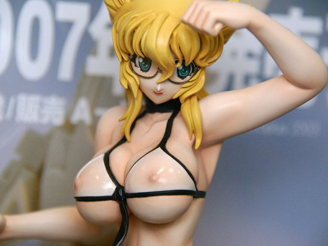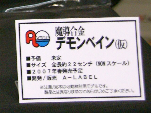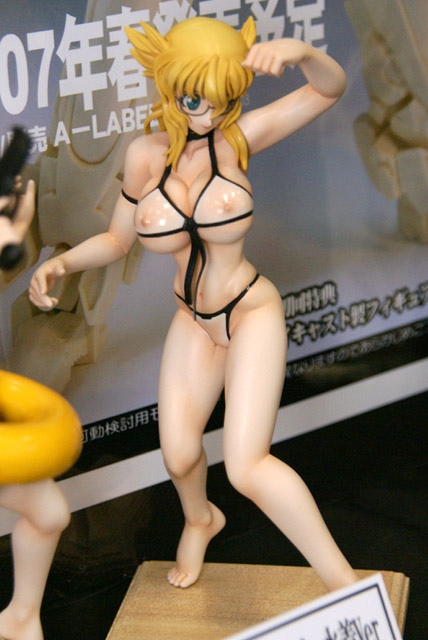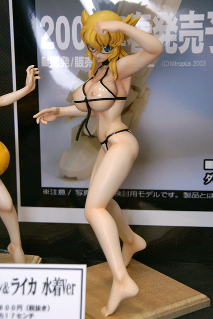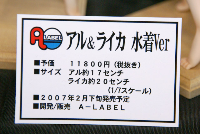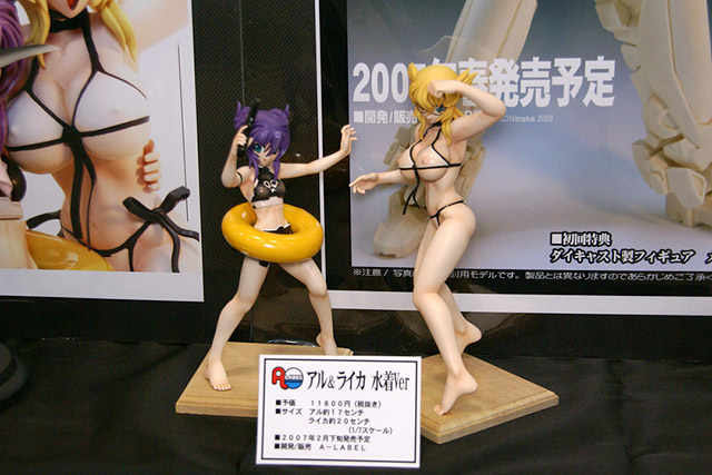 2006年12月23日に開催されたWHF有明15A-labelブースでは、A-label「斬魔大聖デモンベイン アル&ライカ 水着ver.」(AM)のキャストサンプルの展示がされていました、これは、ニトロプラス「斬魔大聖デモンベイン」のキャラ「アル」と「ライカ」を水着姿で立体化もの。展示されていたものは、なぜか豪快な透け塗装版で、ライカは白水着なので、すけた乳首がほぼモロ