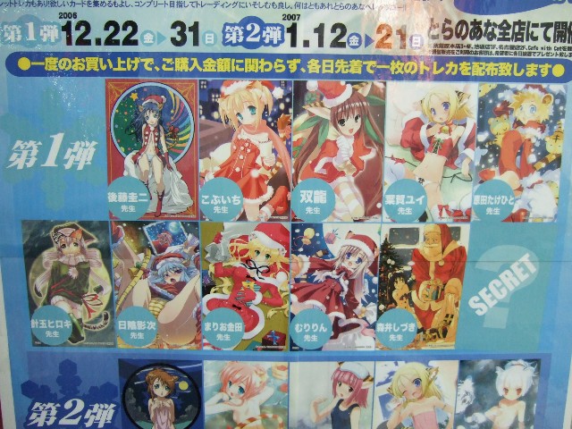 とらのあなのイベント紹介によると「さむ〜い冬も熱い萌えの力で乗り切ろう!今年もやります、とらのあな冬の大感謝祭!!今回も豪華作家陣描き下ろしのオリジナルトレカをプレゼントします。テーマは「クリスマス&温泉」。個性的なサンタ娘やあられもない入浴シーンなど、“萌え”と“エロス”満載の限定トレカです!もちろん今回もシークレットトレカもあり!欲しいカードを集めるもよし、コンプリート目指してトレーディングにいそしむも良し。何はともあれとらのあなへレッツゴー!! 」とされているもので、今回も12月22〜31日が第1弾のサンタコス。2007年1月12日〜21日までが入浴シーンの絵柄となっているみたいです。