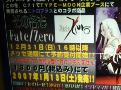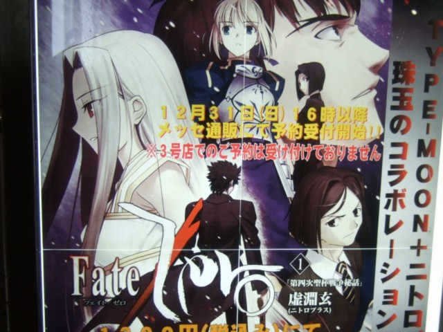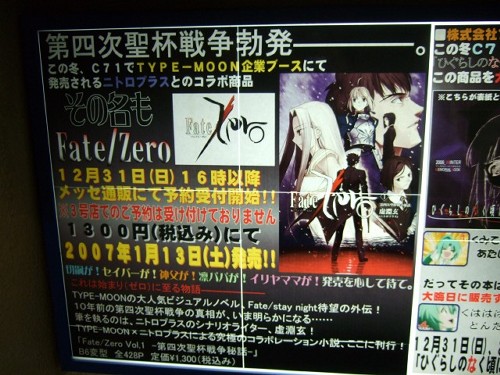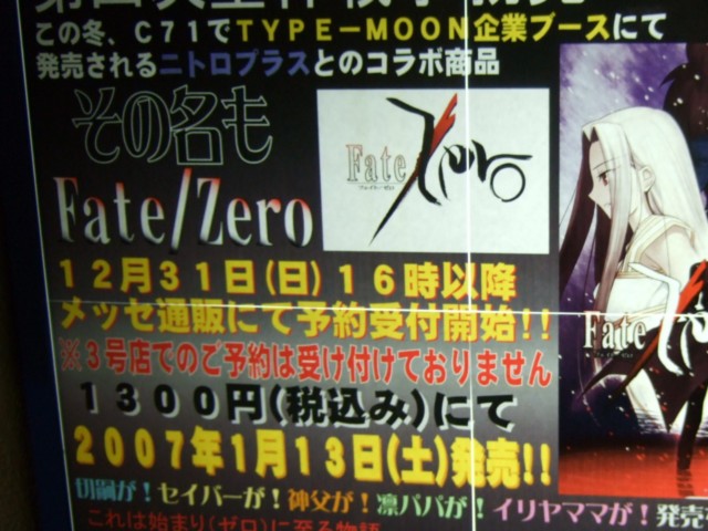 12月25日、メッセサンオーの店頭看板や、階段途中の掲示板などで、コミケ71のTYPE-MOONブースで販売予定の小説「Fate/Zero Vol,1-第四次聖杯戦争秘話-」の通常版を12月31日16時から、通販の受付が開始という告知が掲示されていました。