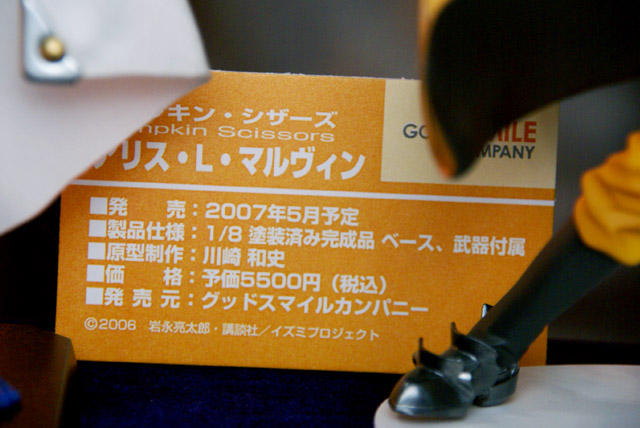 2006年12月23日に開催されたWHF有明15グッドスマイルカンパニーブースでは、グッドスマイルカンパニーの新作「パンプキン・シザーズ アリス・L・マルヴィン」のサンプル展示がされていました。これは、アニメ「パンプキン・シザーズ」の、陸情3課実動隊・小隊長。名門貴族マルヴィン家の三女にして、次期当主という「アリス・L・マルヴィン少尉」を軍服姿で立体化したもの。