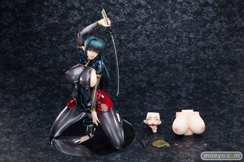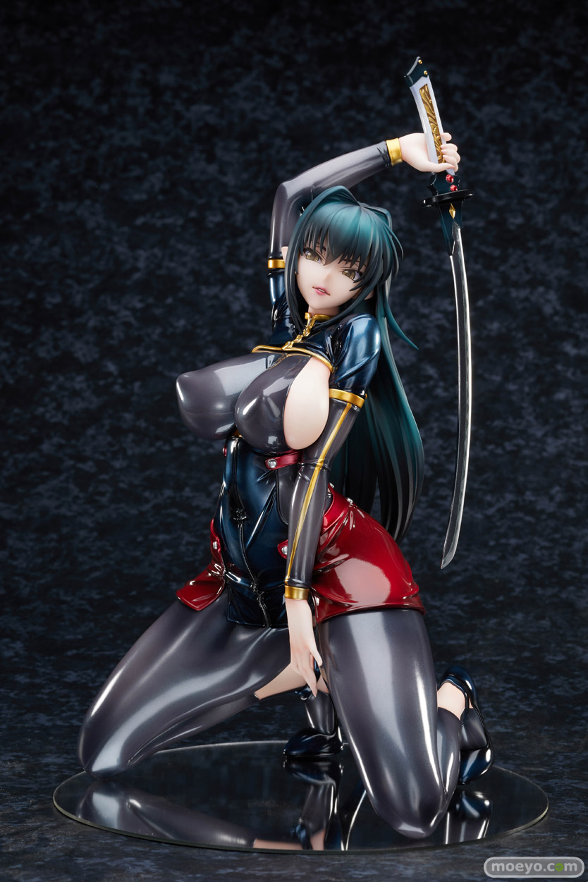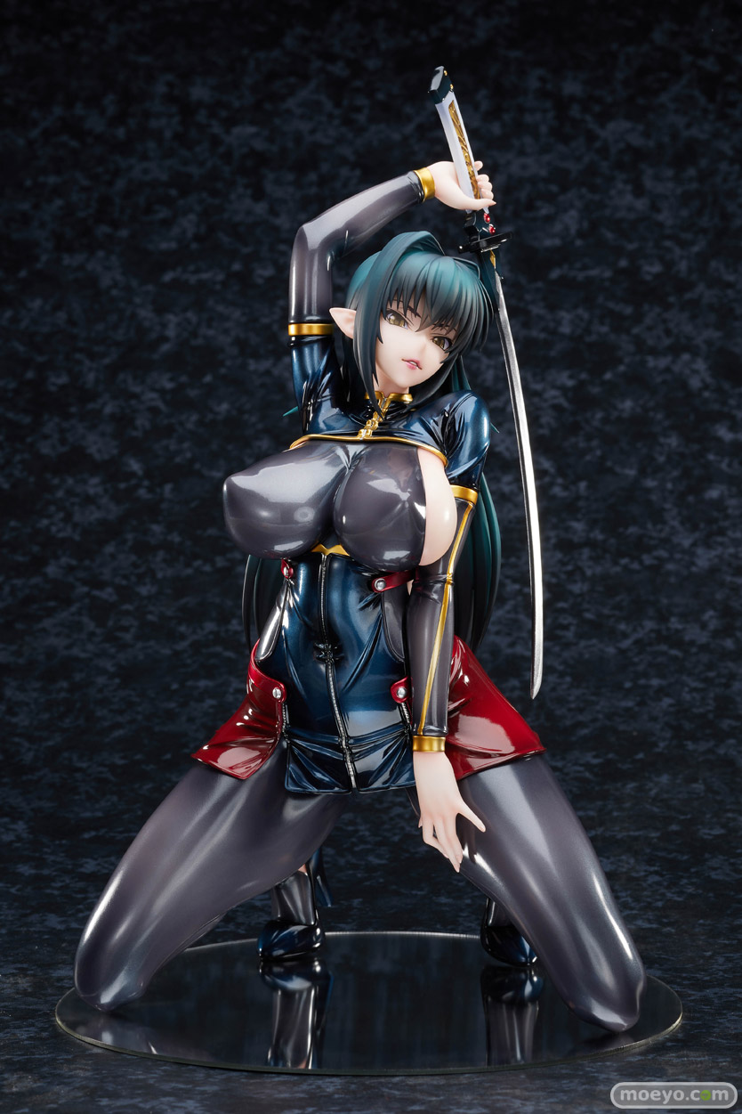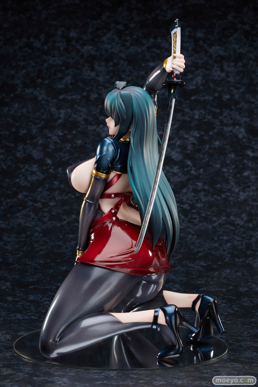 光沢のある漆黒のボディスーツは、妖艶な肢体を際立たせ、張り詰めた質感がリアリティを一層引き立てます。鋭い眼差しと艶やかな表情は、まさに戦場に舞う魔女剣客そのもの。