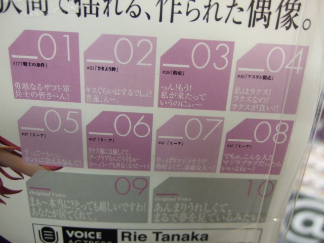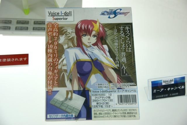 12月26日、バンダイ「Voice I-doll Superior ミーア・キャンベル」(AA)が発売されました。これは、台座に「勇敢なるザフト兵士の皆さーん!」「キスくらいはするでしょ?普通。んー。」などの作中のセリフや、「あんまりうれしくて、まるで夢を見ているみたい。」等のオリジナルを含む10種のセリフを内蔵した、Voice I-dollシリーズとなるもの。キャラシティ2Fでは生サンプル展示も。