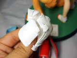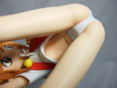 ただ、柔らか素材で強力に接着されているので、カッターなどで切ろうとして力むと、本体の方も傷つけてしまいます。やさしく分割面の先端(シャツの裾からがやりやすいです)を模型用はさみ、もしくは小さめのニッパーなどでゆっくりカットしていきましょう〜。