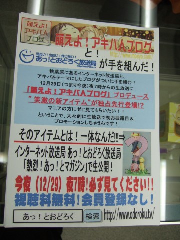 ■ 昨日お伝えした、あっとおどろく放送局熱烈!あっ!とマガジン」でも伝えられたように、秋葉原駅前でトイズプランニングの物販&新商品展示イベントが開催されていますが、その模様の画像を、友人がトイプラさんの許可をもらって撮影してきてくれました。ので、本文の方でざっとではありますが、その画像を掲載しておきますね〜。