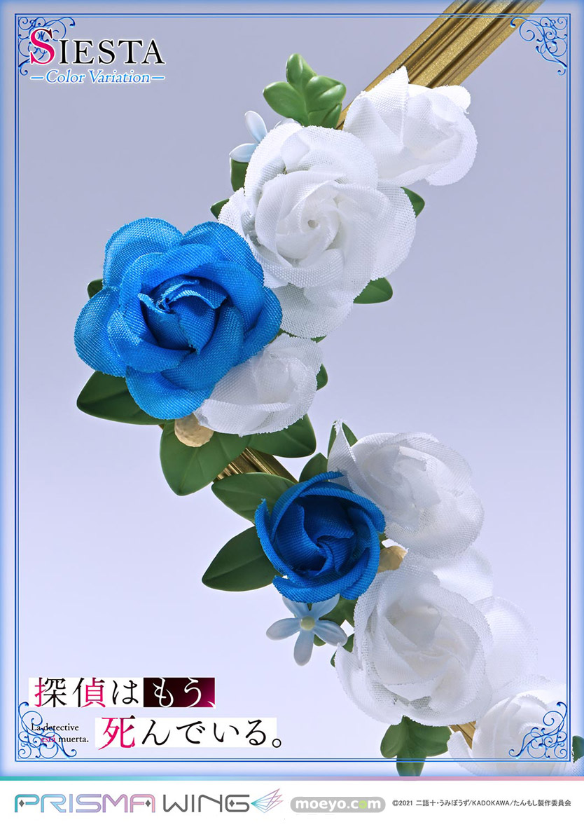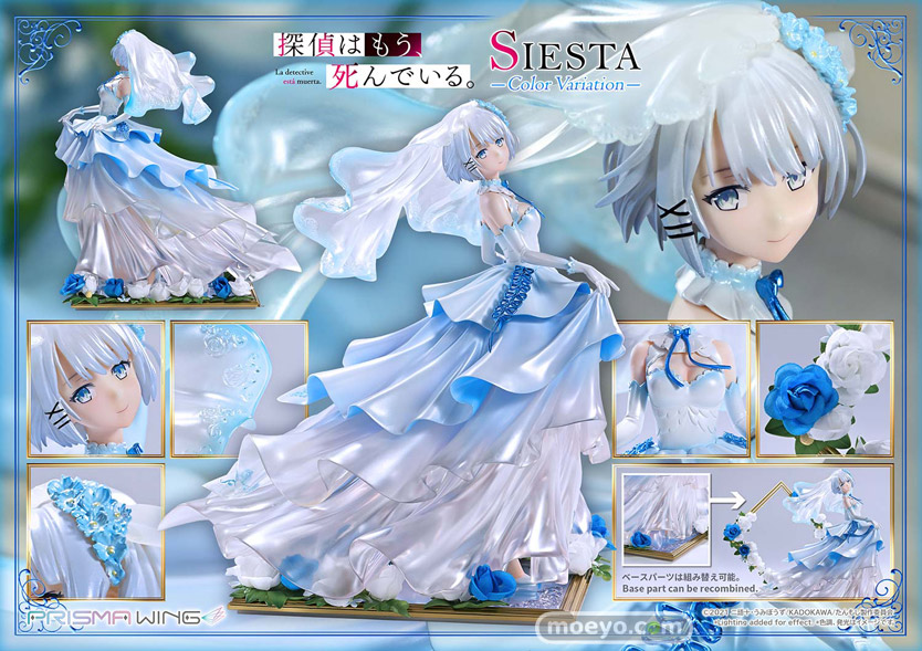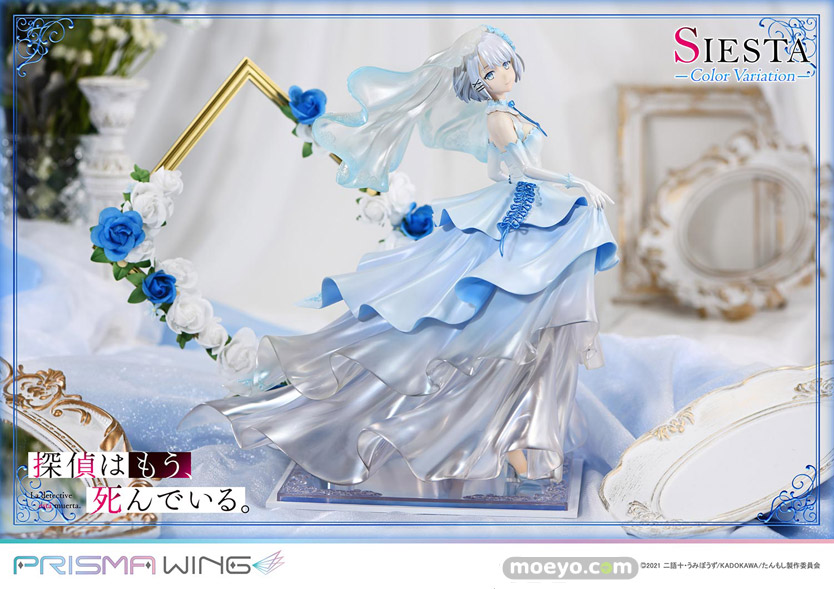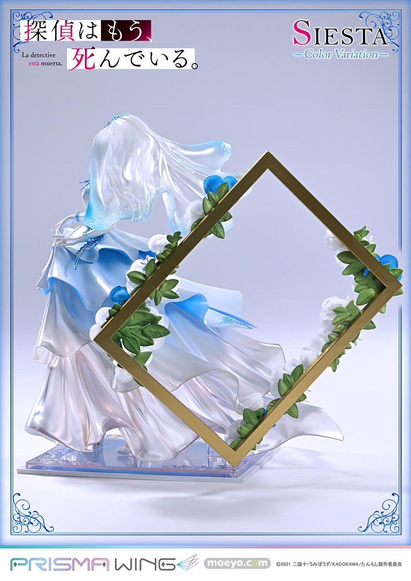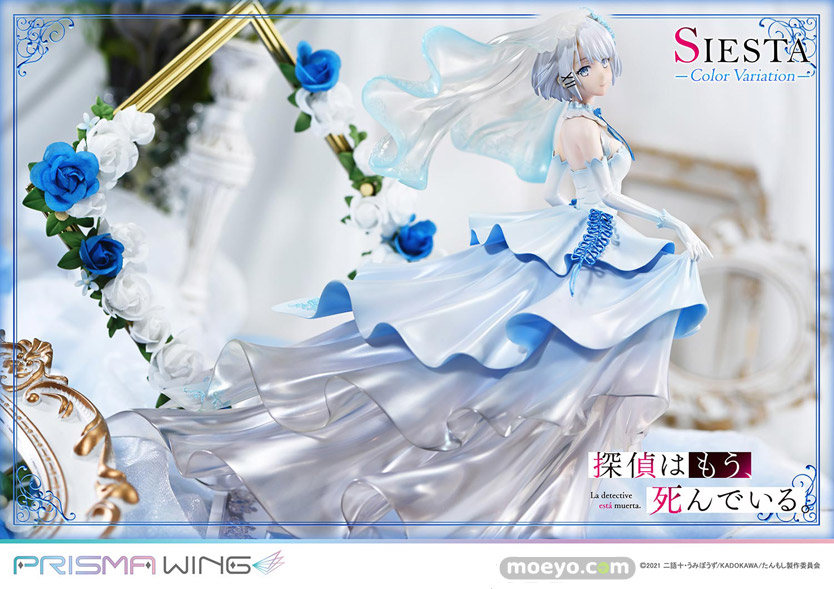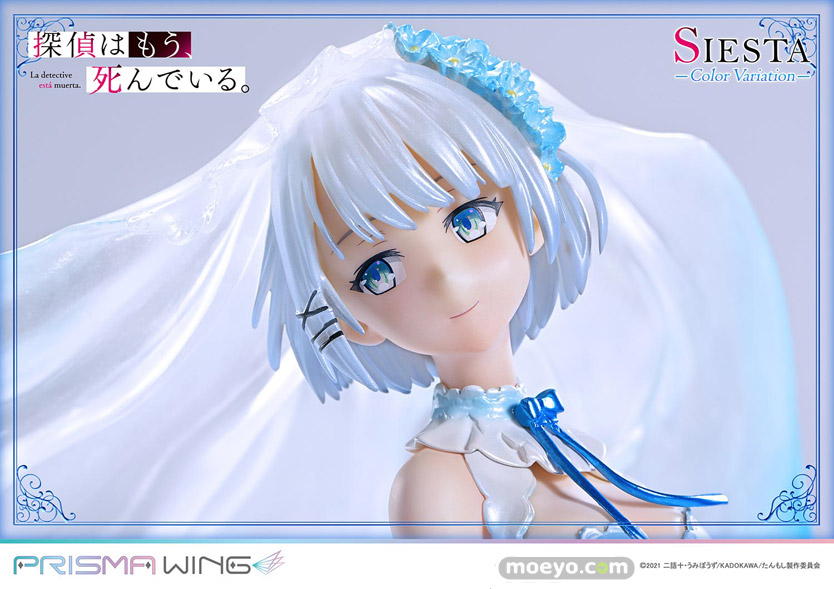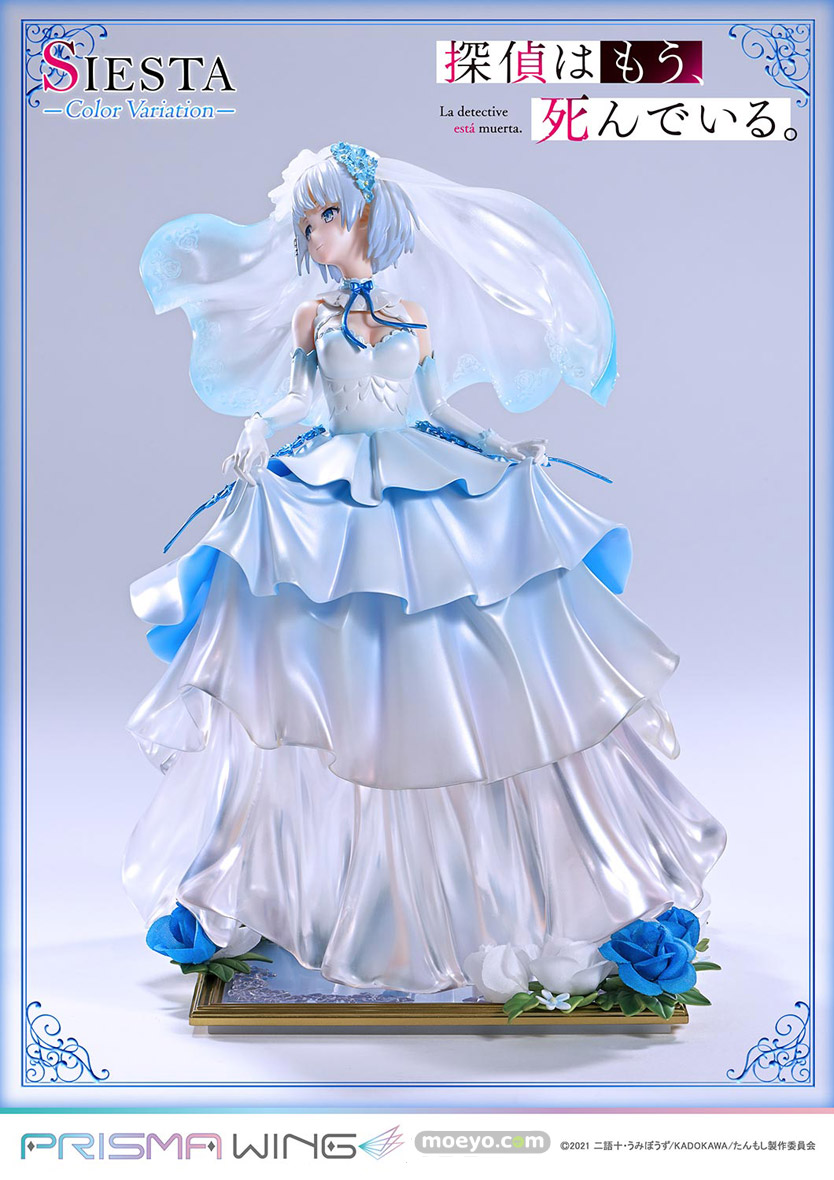 色兼備、天衣無縫、十全十美。TVアニメ『探偵はもう、死んでいる。』から、ウェディング衣装をまとうシエスタのカラーバリエーションが登場!新たに名探偵を彩るのは、澄み切った空や透き通る大海原を思わせるブルーです。バラの刺繍があしらわれたベール、軽やかに揺れるリボン、優美なドレープを見せるスカート。その各部を多彩な色調でペイントしました。純白と重なり生み出すのは、清楚で聡明なイメージ。高い人気を誇る衣装の新鮮な一面を引き出しています。【プライム1スタジオ】