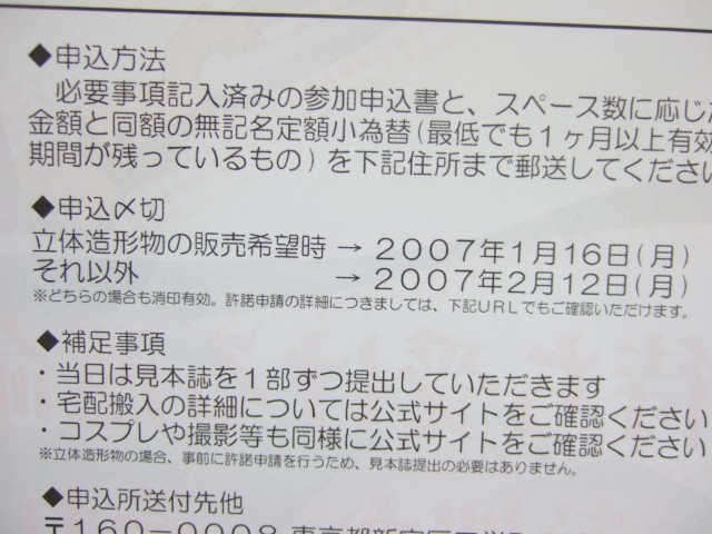 で、チラシ裏面によると、立体物の販売とかもOKみたいです。参加申込締切は、立体造形物の販売希望の方は1月16日(月)消印有効、それ以外(同人誌など)の方は年2月12日(月)消印有効となっています。詳しくは公式のサークル参加案内ページにて。