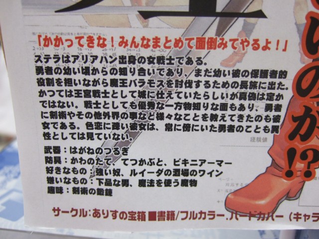 掲示されていたPOPによると「ここまでやっていいのか!?四色ハードカバー仕様はもちろんのこと、キャラクターシート付属、そしてカバーをめくったときの秘密イラストまで収録され完璧なまでに本家を再現した対戦型ビジュアルブック」というもので、ステラはアリアハン出身の女戦士。