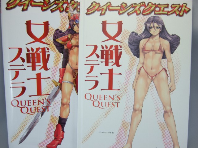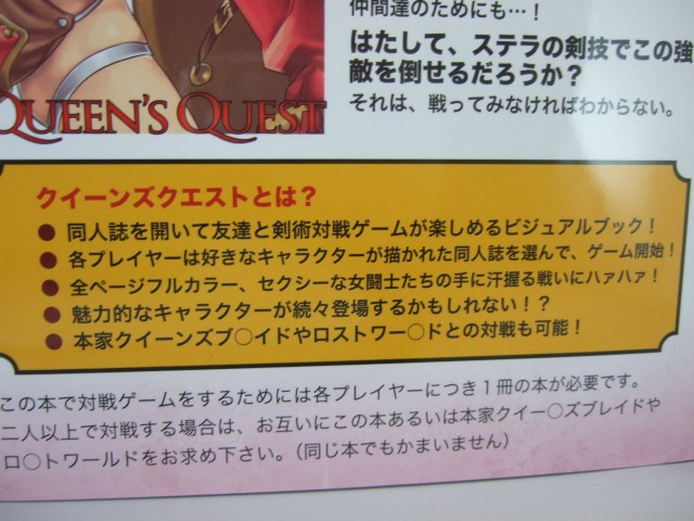 2006年12月31日から、サークルありすの宝箱の、ドラ○エキャラクターをモチーフにした、クイーンズブレイドと完全互換の同人誌「クイーンズクエスト 女戦士ステラ」が、とらのあな専売で発売されていて、とらのあな本店5Fでは「高貴なる戦士レイナ3D」(AA)と、「あれ!?これは・・・乳○?・・・( Д ) ゚ ゚」もあった「冥土へ誘うものアイリ」(AA)と並べられて販売されていました。全く違和感なしw