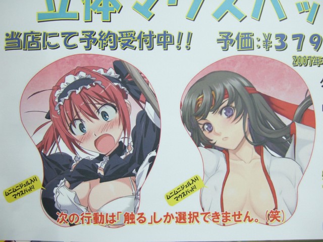 ほか、アキバで一番クイーンズブレイドに力を入れていると思われるK-BOOKSでは、公式で「次の行動は「触る」しか選択できません!」と謳われている「クイーンズブレイド立体マウスパッド アイリ/トモエ」の予約受付が開始していました。