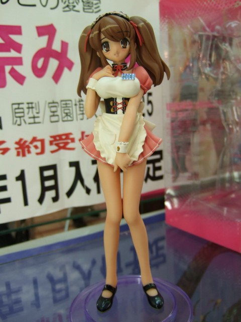 これは。ワンフェス2006夏の海洋堂/オーガニックブースにて初展示されていた、涼宮ハルヒの憂鬱朝比奈みくるを、宮園博久氏が「涼宮ハルヒの溜息」(AA)の表紙のイラストのウェイトレス姿で立体化した、ワンフェスで販売され、即完売したガレキをPVC完成品にしたもの。