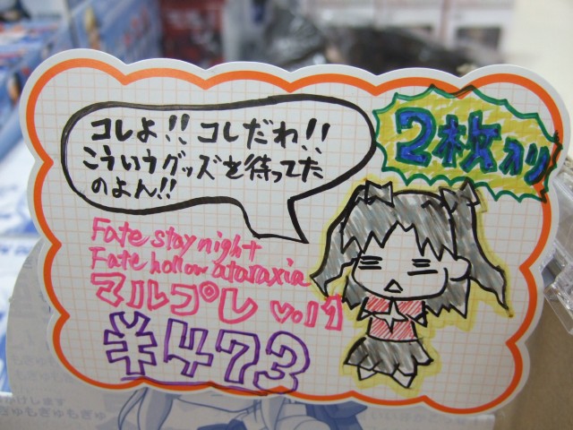 2006年12月末に発売されている、ソル・インターナショナルの「Fate/Stay night Fate/hollow ataraxia マルプレ 第1弾」(AM)ですが、とらのあな本店5Fでは、全20種中12種の現物サンプルを展示しています。発売日にはなかったヘタレPOPも追加されていて、それによると「コレよ!コレだわ!こういうグッズをまってたのよん!!」とのこと。画像はその中の一枚の「留守中」