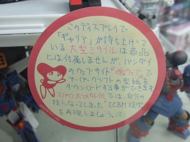 これは、キャラシティのPOPによると魂ウェブで期間限定ダウンロードサービスされている、「大型ミサイル ペーパークラフト」を組み立てたものみたいで、「スパロボα外伝では、自分の技になってしまった”ICBM投げ”を再現しましょう(笑)」とされていました。