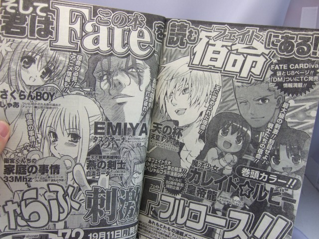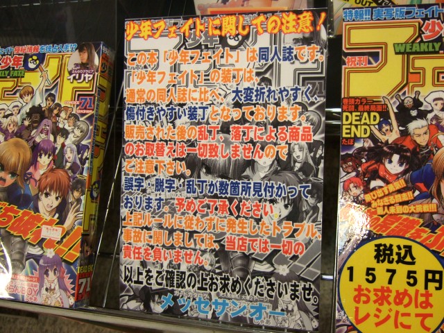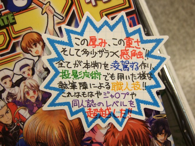 1月12日、冬コミで頒布された、同人誌「少年フェイト」がアキバの同人ショップなどで発売となりました。これは、マンガはもちろん、広告や巻頭特集なども「らしく」作られた、週間少年ジャンプそっくりなFateオンリーの同人誌。メッセのPOPによると「この厚み、この重さ、そしてこの多少ざらつく感触!!すべてが本物を凌駕するつくり、投影魔術でも用いたような執筆陣による職人技!!」
