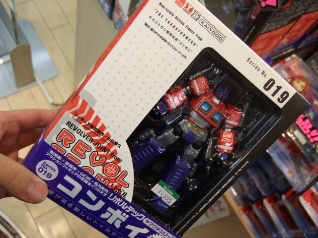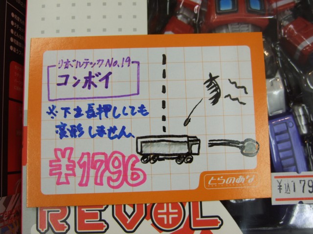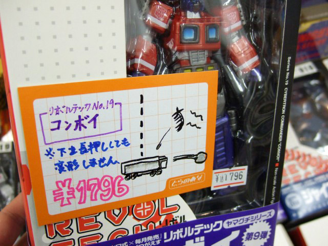 1月15日、毎月恒例の海洋堂のリボルテックの発売日となり、アキバの各ショップでも、「No.018 ジャイアントロボ」(AM)、「No.019 コンボイ」(AM)、「Fショップ限定 ウルトラマグナス」(AM)の3種が発売されていました。いつも素敵なPOPを展開しているとらのあな本店でも入荷していて、コンボイのPOPによると「下を長押ししても変形しません」とのこと。たぶんもとネタはこれw