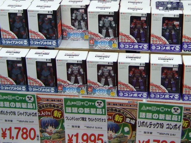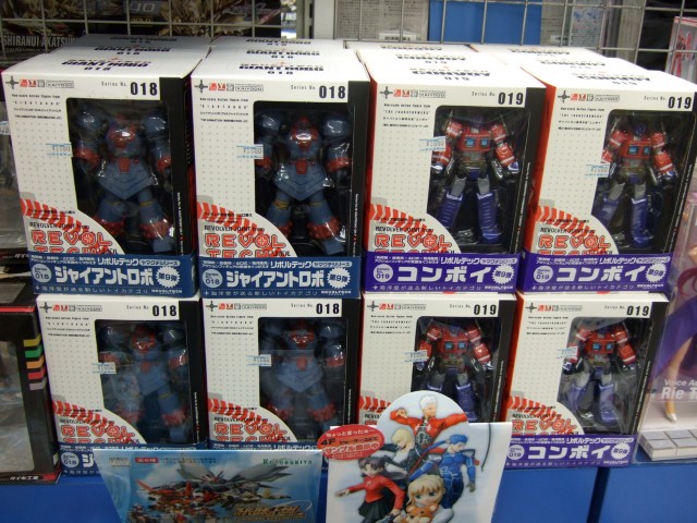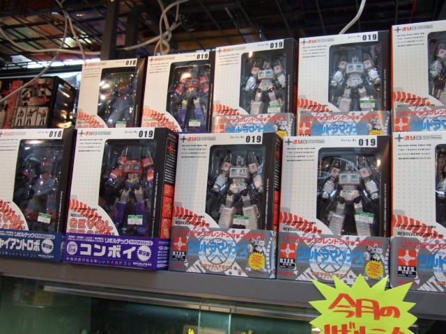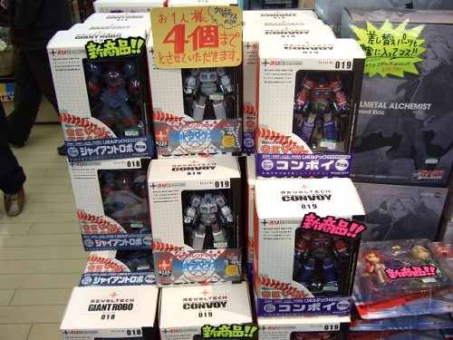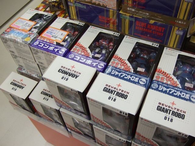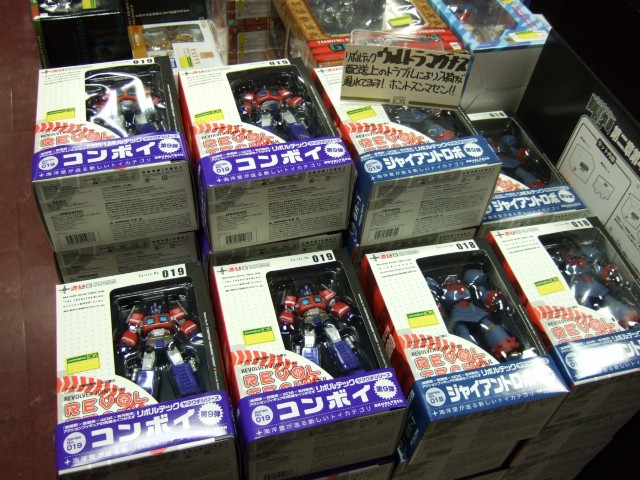 1月15日、毎月恒例の海洋堂のリボルテックの発売日となり、アキバの各ショップでも、「No.018 ジャイアントロボ」(AM)、「No.019 コンボイ」(AM)、「Fショップ限定 ウルトラマグナス」(AM)の3種が発売されていました。
