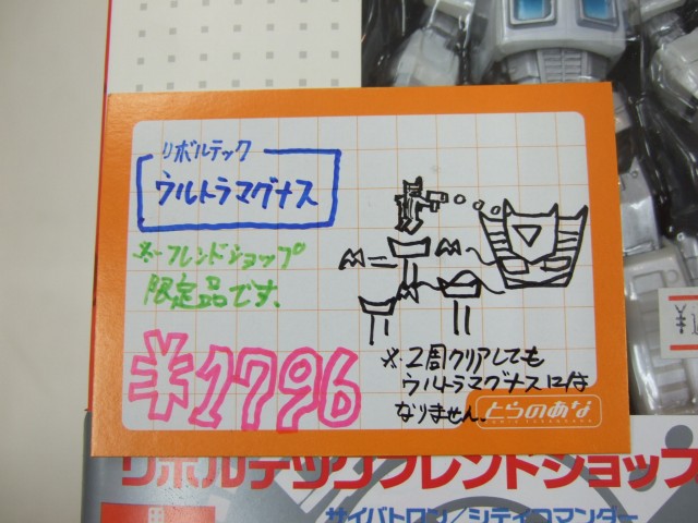 いつも素敵なPOPを展開しているとらのあな本店でも入荷していて、「No.019 コンボイ」(AM)のPOPには「下を長押ししても変形しません」としていて、「Fショップ限定 ウルトラマグナス」(AM)のPOPでは「2周クリアしてもウルトラマグナスにはなりません。」とされていました。